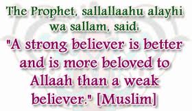 (1) “బలవంతుడైన విశ్వాసి బలహీనుడైన విశ్వాసికన్నా మేలైనవాడు. అతను అల్లాహ్ కు ప్రీతిపాత్రుడు”