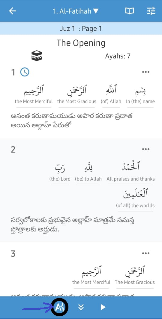 (3) పైన బొమ్మలో సూరహ్ ఫాతిహా లేదా ఇంకా ఏదైనా సూరహ్ క్లిక్ చెయ్యండి