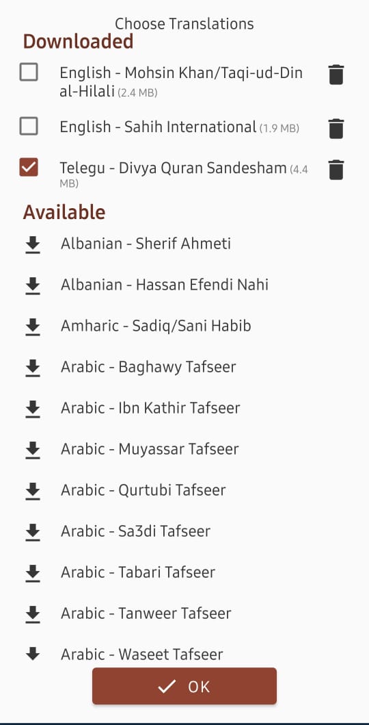 (5) పైన బొమ్మలో తెలుగు ట్రాన్స్ లేషన్ (అహ్సనుల్ బయాన్ లేదా దివ్య ఖురాన్ సందేశం) సెలెక్ట్ చేసుకొని డౌన్లోడ్ చేసుకోండి. ఇప్పుడు మీరు ప్రతి ఆయత్ కి తెలుగు అర్ధం చదువుకోవచ్చు