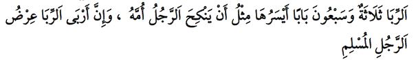 “వడ్డీలో 73 స్థాయిలున్నాయి. వాటిలో అత్యంత హీనమైన స్థాయి (దశ) యొక్క పాపం; ఒక వ్యక్తి తన కన్న తల్లిని పెళ్ళాడటం వంటిది. వడ్డీ యొక్క అత్యంత తీవ్రస్థాయి పాపం ఒక ముస్లిం పరువు ప్రతిష్టలను మంటగలపటం”. (ముస్తద్రక్ హాకిం: 2/37, సహీహుల్ జామి: 3533. ).