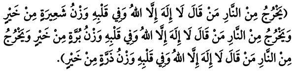 “లాఇలాహ ఇల్లల్లాహ్ పఠించిన వక్తి హృదయంలో జొన్న గింజంత విశ్వాసమున్నా నరకం నుండి వెలికి వస్తాడు. ఏ వ్యక్తి లాఇలాహ ఇల్లల్లాహ్ చదివాడో అతని హృదయంలో గోదుమ గింజంత విశ్వాసమున్నా నరకం నుండి వెలికి వస్తాడు. అలాగే ఎవరు లాఇలాహ ఇల్లల్లాహ్ చదివాడో అతని మనుస్సులో ఇసుమంత / రవ్వంత విశ్వాసమున్నా అతనూ నరకం నుండి వెలికి వస్తాడు”. (బుఖారి 44, ముస్లిం 193).