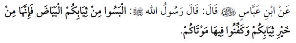 “మీరు తెల్లని దుస్తులు ధరించండి. మీ దుస్లులలోకెల్లా అతి ఉత్తమమైనవి ఇవే. మీ మృతులకు కూడా ఈ తెల్లని వస్త్రాలతోనే కఫన్ ఏర్పాటు చేయండి”. (అబూ దావూద్/అత్తిబ్/ ఫిల్ అమ్రి బిల్ కొహ్ లి 3878, తిర్మిజి/మా యుస్తహబ్బు మినల్ అక్సాన్ 994).