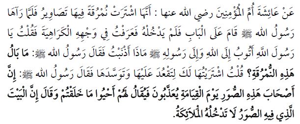 ఆయిషా (రజియల్లాహు అన్హా) ఉల్లేఖనం ప్రకారం, ఆమె బొమ్మలు గీసి యున్న ఒక దిండు కొన్నది. ప్రవక్త (సల్లల్లాహు అలైహి వసల్లం) బయటి నుండి వచ్చి దానిని చూడగానే తలుపు దగ్గరే ఆగిపోయారు. లోపలికి ప్రవేశించలేదు. ప్రవక్త (సల్లల్లాహు అలైహి వసల్లం) ముఖంలో ఏదో ఇష్టం లేని చిహ్నాలు చూసి, ప్రవక్తా! నేను అల్లాహ్ వైపునకు తర్వాత ఆయన ప్రవక్త వైపునకు మరలుతున్నాను (క్షమాపణ కోరుకుంటున్నాను). నాతో జరిగిన తప్పేమిటో సెలవియ్యండి అని అన్నాను. అందుకు ఆయన “ఈ దిండు సంగతేమిటి?” అని మందలించారు. దీనికి మీరు ఆనుకొని కూర్చుంటారనే ఉద్దేశంతో నేను కొన్నాను అని చెప్పాను. అప్పుడు ప్రవక్త (సల్లల్లాహు అలైహి వసల్లం) చెప్పారు: