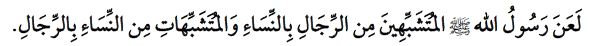 “స్త్రీల వేషాధారణ వేసుకునే పురుషులను, పురుషుల వేషాధారణ వేసుకునే స్త్రీలను ప్రవక్త (సల్లల్లాహు అలైహి వసల్లం) శపించారు”. (బుఖారి/అల్ ముతషబ్బిహూన బిన్నిసా… 5885).