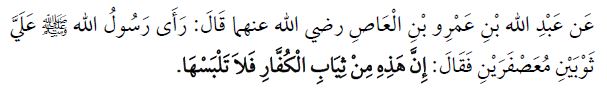 ప్రవక్త (సల్లల్లాహు అలైహి వసల్లం) నా ఒంటిపై కాషాయ రంగుతో కూడిన రెండు బట్టలు చూసి, “ఇవి అవిశ్వాసులు ధరించే బట్టల్లో ఒక రకమైనవి, నీవు వీటిని ధరించకు” అని చెప్పారు. (ముస్లిం/ అన్నహ్ యు అన్ లుబ్బిర్రజులి… 2077).
