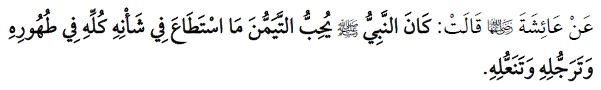 “ప్రవక్త సల్లల్లాహు అలైహి వసల్లం సాధ్యమైనంత వరకు మంచి కార్యాలు కుడి వైపు నుండి చేయడం మరియు మొదలు పెట్టటం ఇష్టపడేవారు. అది వుజూలోనైనా, తల దువ్వుకునేటప్పడైనా మరియు చెప్పులు తొడిగేటప్పుడైనా”. (బుఖారి 426, ముస్లిం 268).