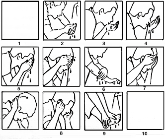5- రెండు చేతులు మూడేసి సార్లు కడగాలి. వ్రేలు మొదటి భాగము నుండి మోచేతుల వరకు. ముందు కుడి చెయ్యి, తరువాత ఎడమ చెయ్యి. (చి.6)