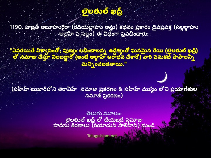 “ఎవరైతే పది ఆయతులు చదువుతూ నమాజ్ చేస్తారో, వారు అశ్రద్ధ వహించే వారిలో లెక్కించబడరు. మరి ఎవరైతే వంద ఆయతులు పఠిస్తారో, నమాజ్ చేస్తూ, వారు అల్లాహ్ యొక్క ఆరాధన ఎంతో శ్రద్ధగా చేసే వారిలో లిఖించబడతారు. మరి ఎవరైతే వెయ్యి ఆయతులు చేస్తూ నమాజ్ చేస్తారో, వారిని ముకన్తరీన్లో లిఖించబడుతుంది.”